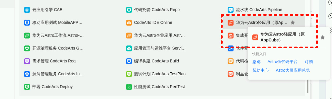 1、步骤1在"控制台"中,选择"开发与运维>Astro轻应用”