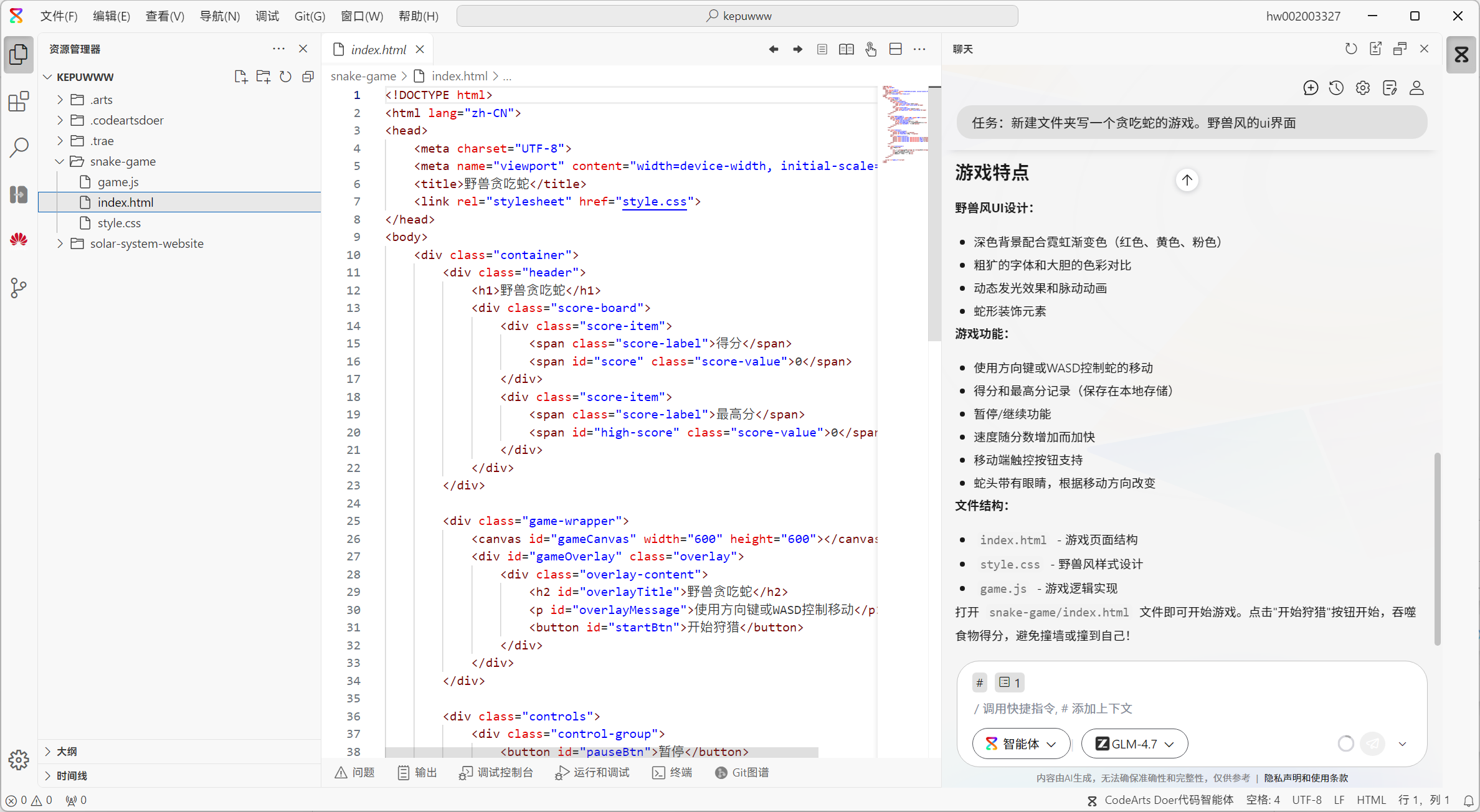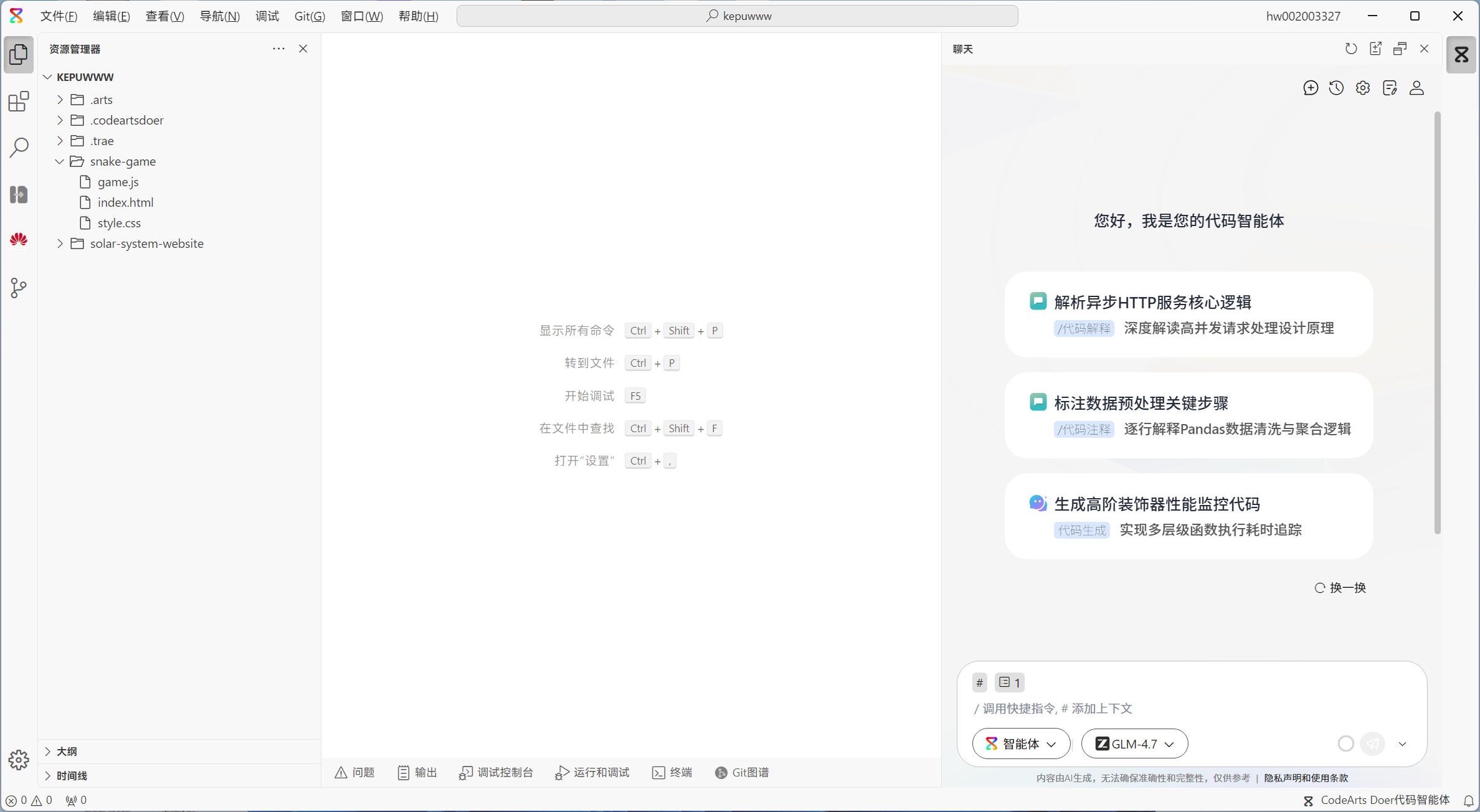 使用CodeArts Doer编辑过的已有项目,打开软件时自动恢复关闭软件前的状态。打开使用CodeArts Doer编辑过的项目自动恢复关闭文件夹前的状态,比如聊天状态,代码编辑,编辑窗口打开状态等。如下图示,比如我关闭前是这个状态,我下次打开还是这个状态,这对继续开发会比较友好。