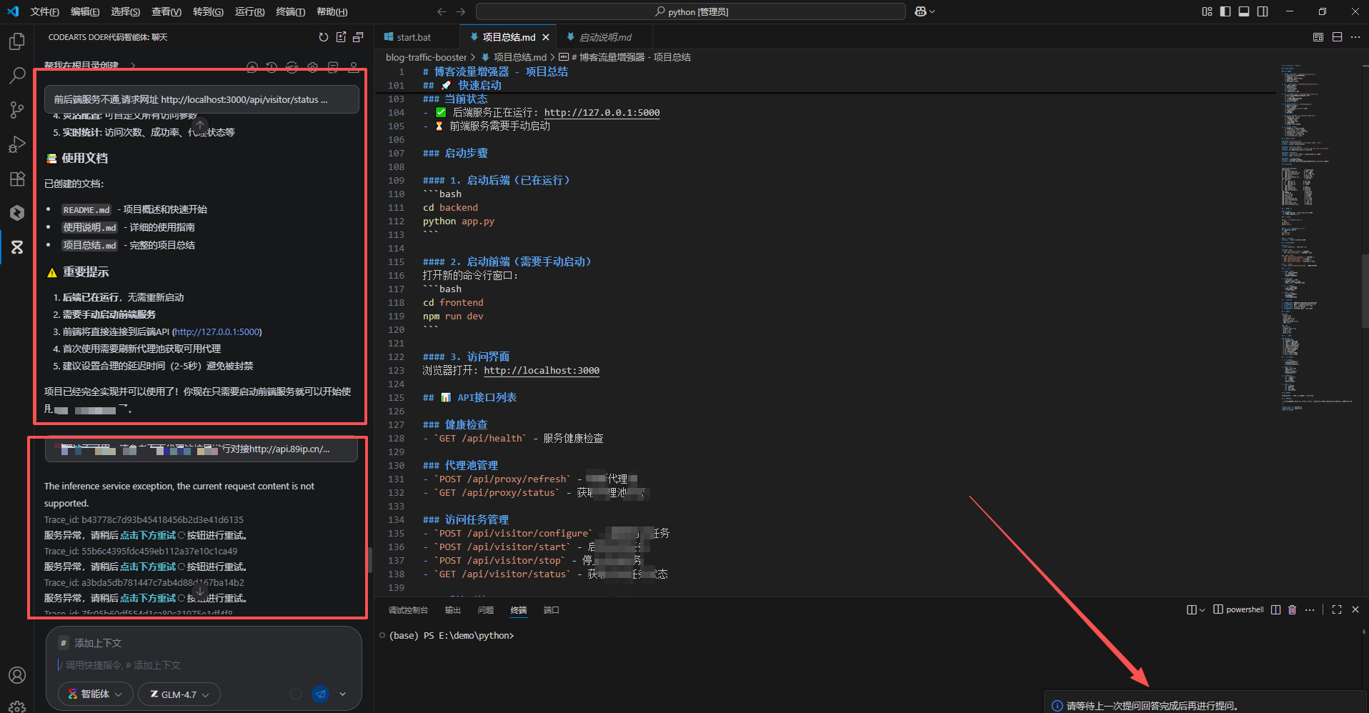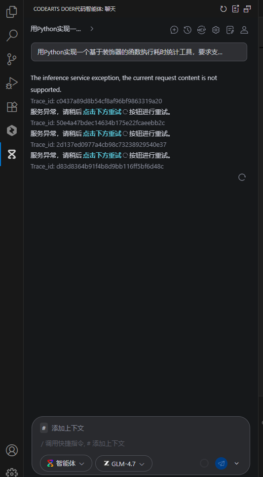 vscode CodeArts Doer 版本 26.1.101 服务异常,提示请等待上一次回答完成后再进行提问,重启vscode、重新打开新窗口提问均异常
