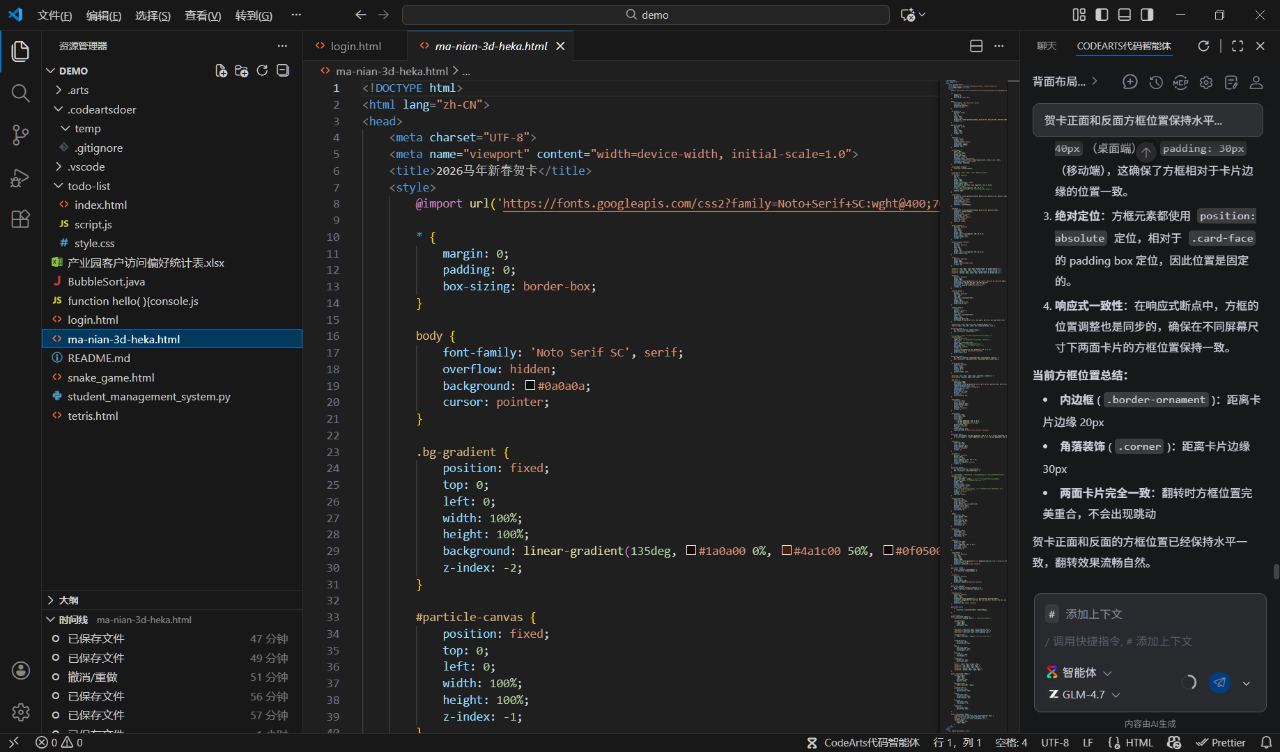 场景描述:Coderats智能体接受VS-CODER代码编译图片出错,贺卡正面和背面的位置不正常,告知情况进行修改多次都是错误的