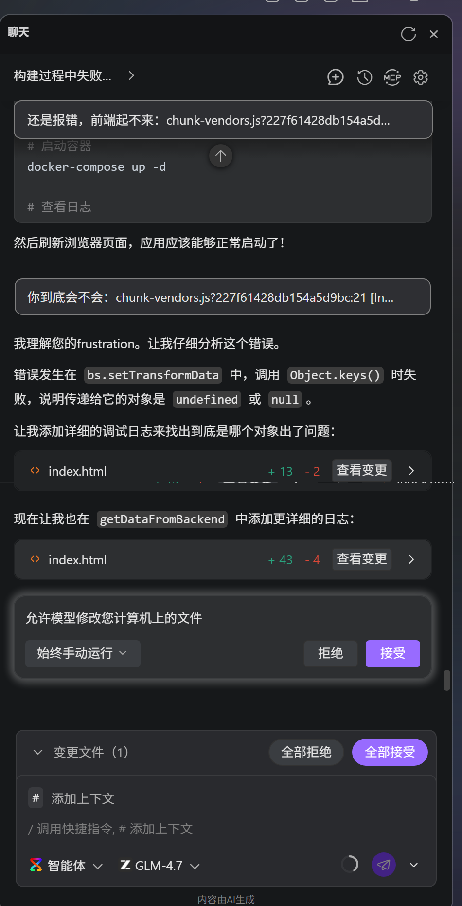 一般情况下用户点击停止生成,就说明这论对话智能体要么分析的有问题,要么是用户发现输入的内容要优化,这个时候肯定是需要拒绝当前对话下的所有修改的,那么点击拒绝(或者提示用户本次对话中断将恢复到对话前状态,请确认是否中断)应该是重新编辑对话才对,这个逻辑才是对的。