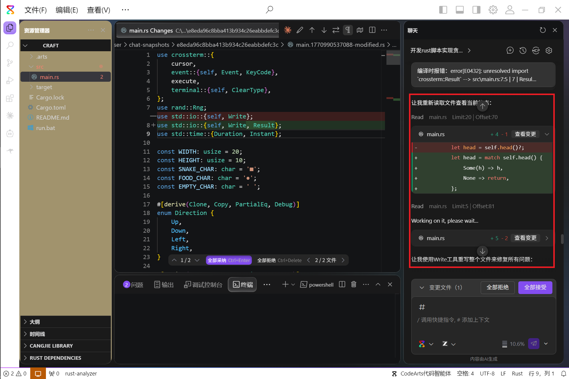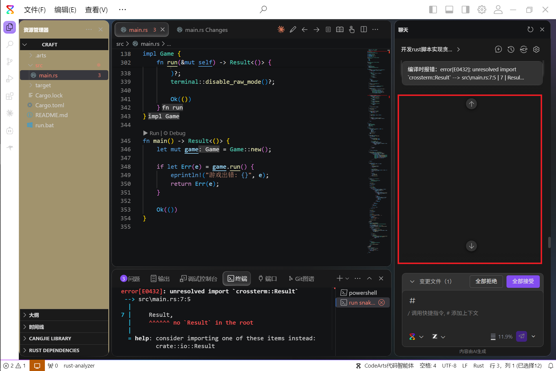 场景描述:等智能体完成第一轮rust编码需求后关闭IDE,之后第二次再打开IDE选择智能体历史项目并进入提交第二轮修改时,智能体对话界面会出现一段空白,大模型回复的文字会被挤压到不可见区(得用鼠标滚轮上滑才能看见)