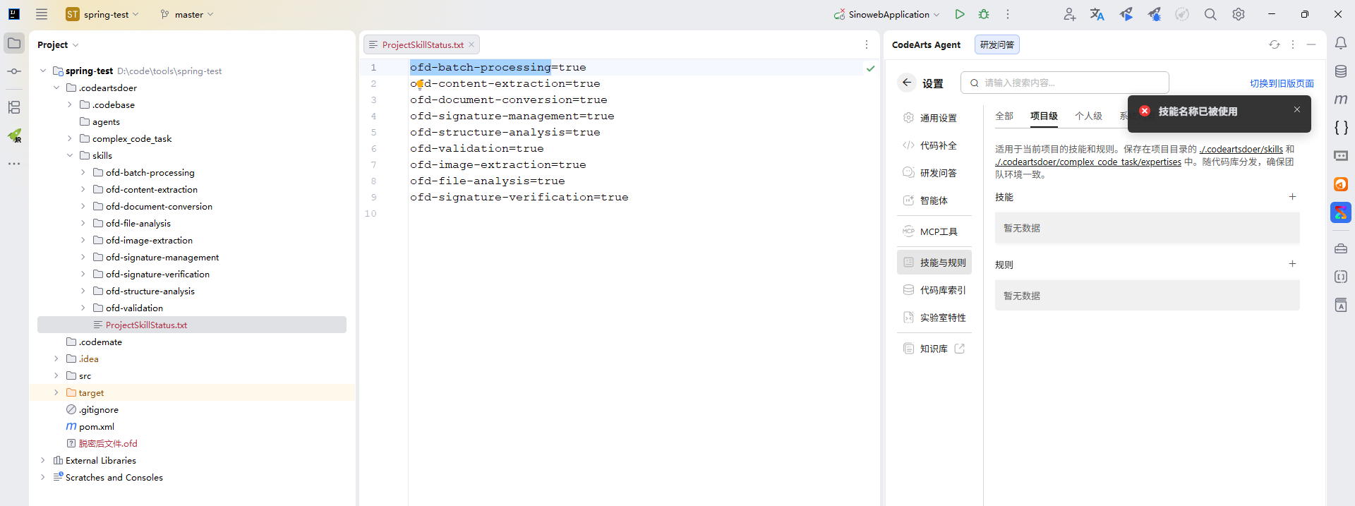 - 项目级技能列表不显示,新增会提示“技能名称已被使用”