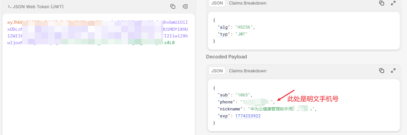 在网页抓包数据的身份认证头部进行了JWT解析还原 发现解析后包含用户敏感账户信息(用户注册手机号)