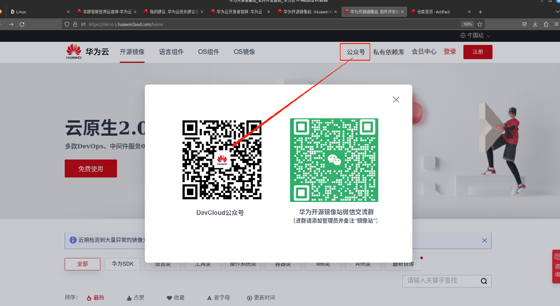 顶部banner公众号->DevCloud公众号扫描之后是CodeArts公众号