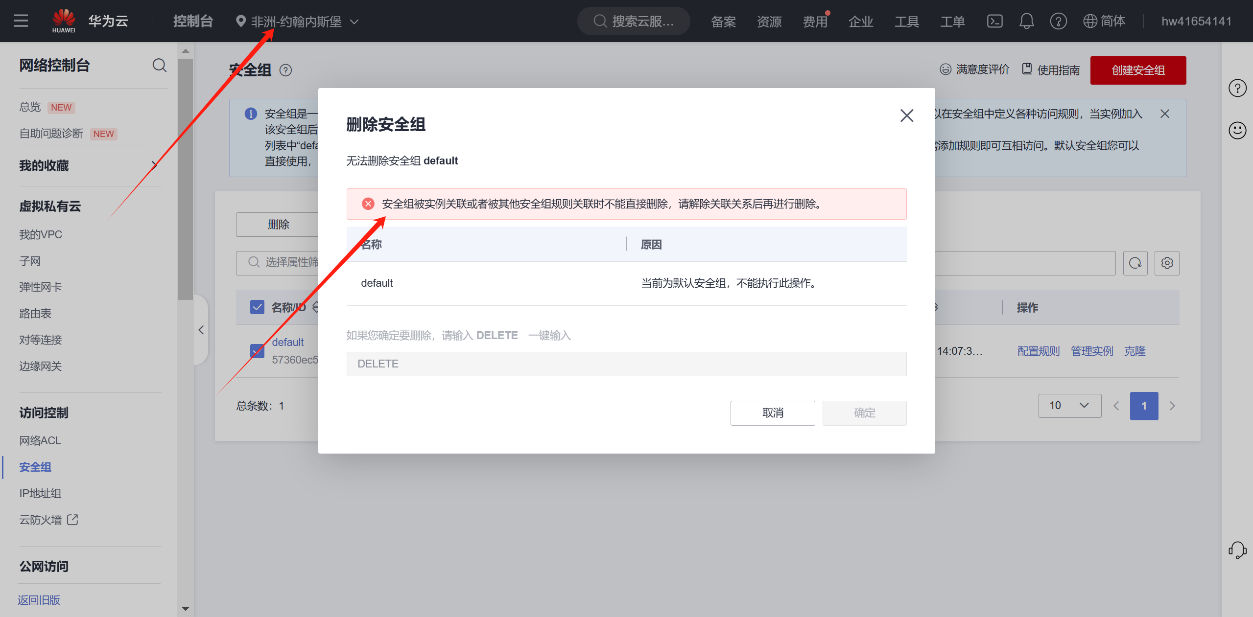 场景描述:不知道什么时候创建了一个非洲的安全组,这个没有用,想着删除一下。提示被关联了 ? 但我实在是不知道在哪关联的,这种是不是可以优化一下。显示一下被关联的是哪个实例可以直接跳转过去进行解除?
