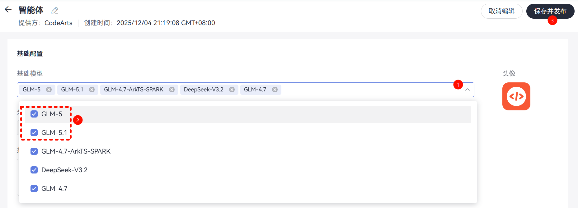 这个问题,大家需要检查https://devcloud.cn-north-4.huaweicloud.cn/doer/agent/home中的Agent管理页面(如图1所示),检查智能体和智能问答两个板块的基础配置中(如图2所示),基础模型是否包含了GLM-5和GLM-5.1。勾选上以后,点击保存并发布,问题解决