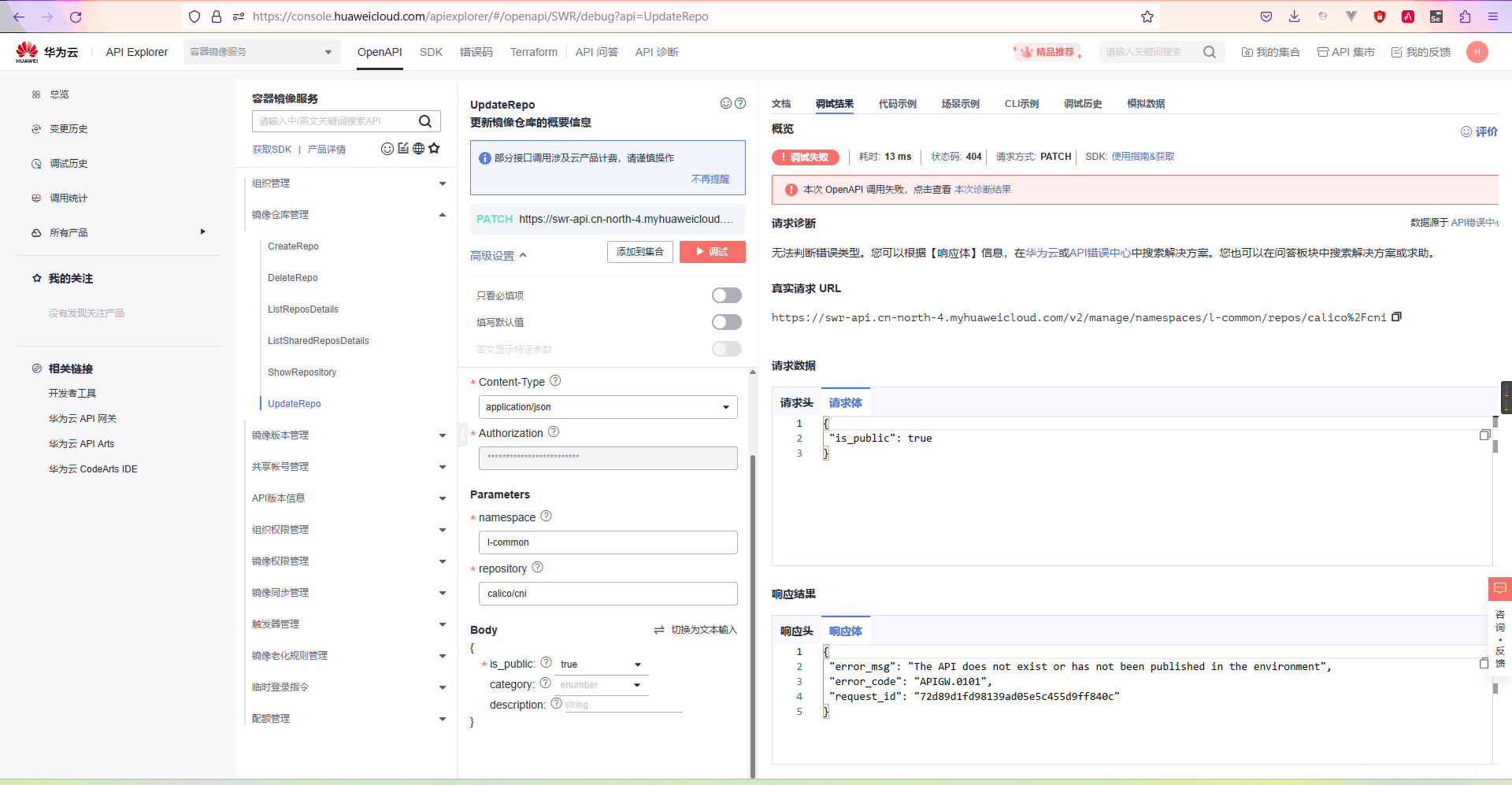 https://console.huaweicloud.cn/apiexplorer/#/openapi/SWR/debug?historyId=8f437d900b9c4585a72f4abdc6303c93