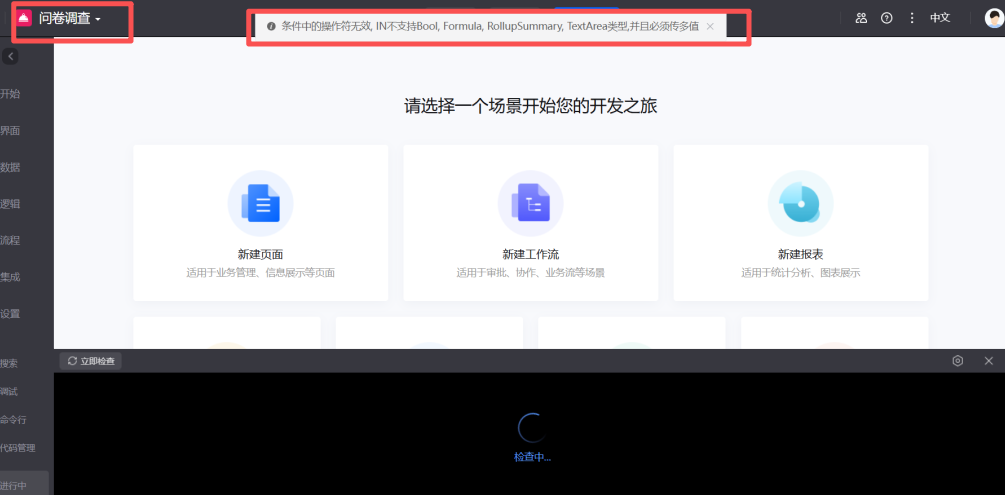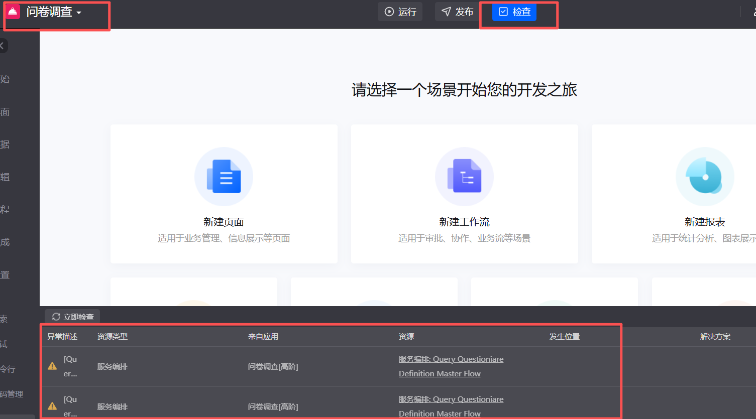 场景描述:【开发者空间体验官】开发者空间Astro 低代码开发问卷调查有问题,安装问卷调查后点击检查后,出现错误提示,需要及时修复。