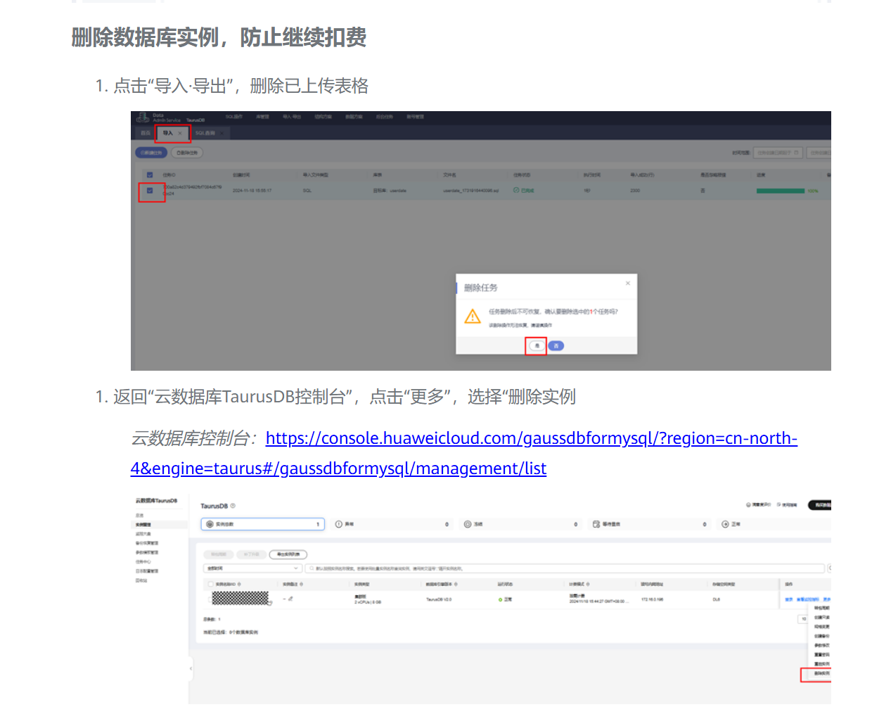 仅提示了删除数据库实例,但是前面其实还创建了存储桶OBS