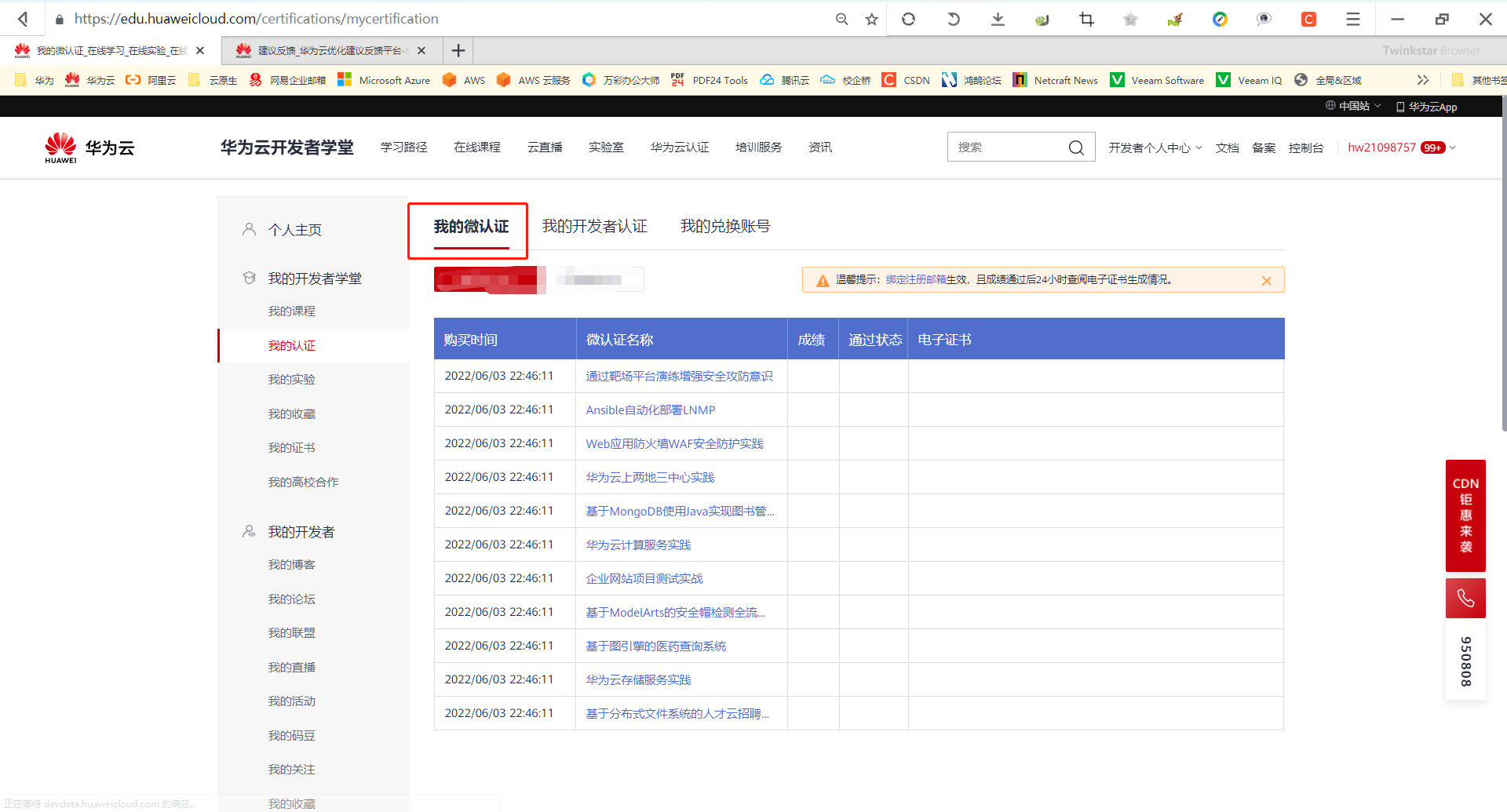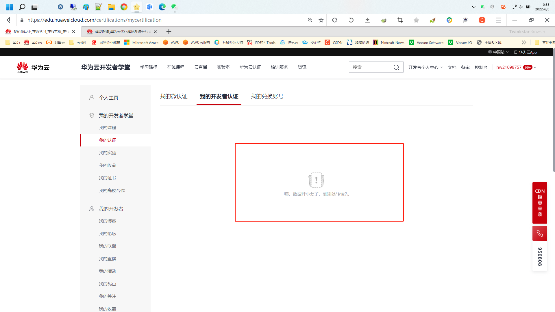 2.打开我的认证页面,点击开发者认证,然后刷新页面,就会自动跳转到微认证页面