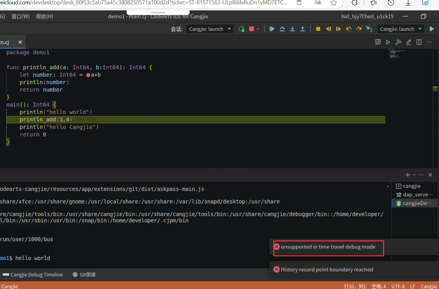 【功能建议】【开发者空间体验官】仓颉体验案例断点后推出报错 已实现 编辑 删除
