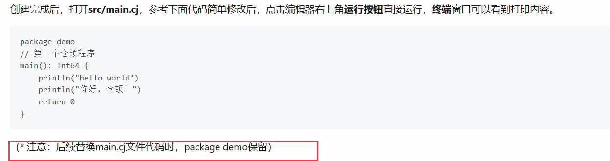 案例里有很多《后续替换main.cj文件代码时,package demo保留》类似于这种的介绍,但是如果新建项目是名字自定义了可能会有异议,有的示例代码里会有package demo行,新手直接粘贴可能不太友好
