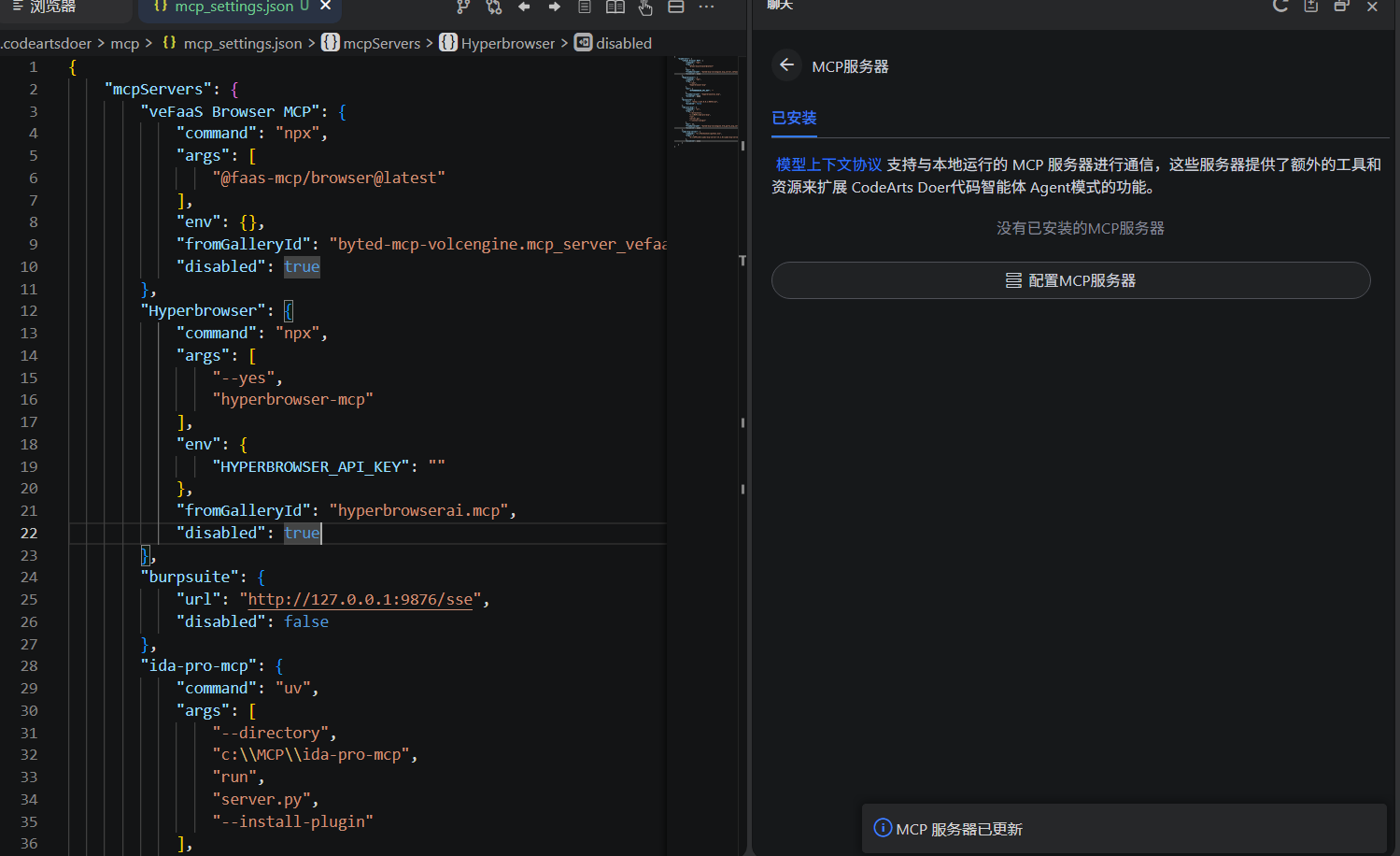 我在IDE和VScode中都添加了,显示已更新,但是仍然显示没有安装的MCP服务器