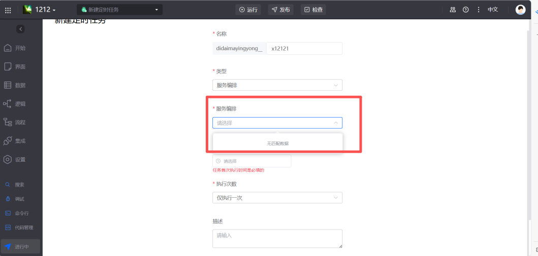 场景描述:【开发者空间体验官】开发者空间Astro 低代码开发新建定时任务有问题,新建定时任务中的服务编排下拉菜单无数据,而服务编排要求不能为空,自己输入也不好使,这样新建定时任务功能就无法实现,请及时修复。